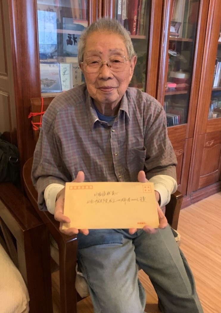 在走訪慰問過程中,黃曉華與葉瑞福親切交談,感謝他幾十年來為集團公司文化宣傳事業(yè)做出的貢獻,同時感謝他在2020年向集團捐贈一批多年珍藏的歷史資料。今年89歲的葉瑞福是傷殘退伍軍人,是集團原中演公司宣傳、資料管理方面負責人,承擔演出項目的宣傳及藝術(shù)檔案等工作。慰問過程中,葉瑞福同志拿出早已準備好的兩個信封交給隨黃書記一同前往的工作人員,一個信封里裝有他本人2021年黨費,另一個信封裝有為慶祝中國共產(chǎn)黨成立100周年繳納的特殊黨費1000元,以表達對黨的感激之情,向黨獻禮。